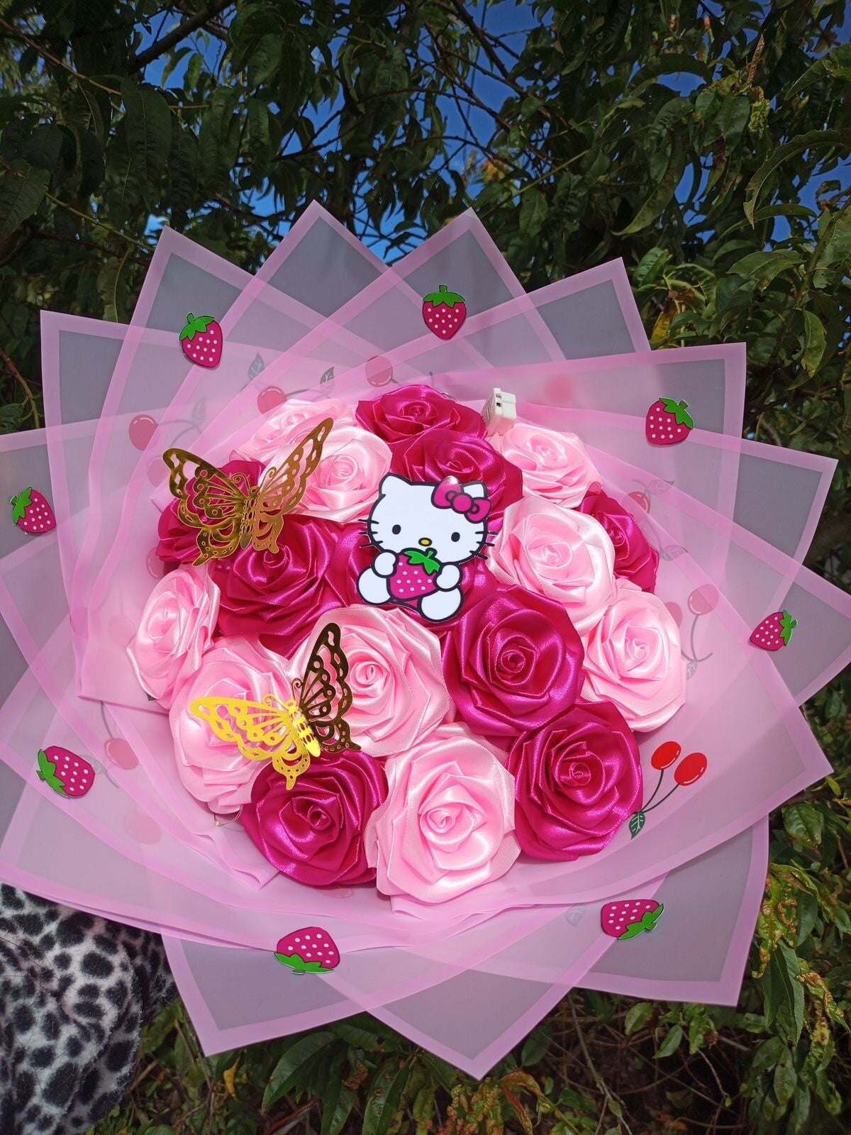 A playful and sweet Hello Kitty-themed floral bouquet, designed with a soft pink aesthetic and charming details. This arrangement features beautifully crafted roses in blush and vibrant pink tones, carefully arranged to create a full and elegant display.